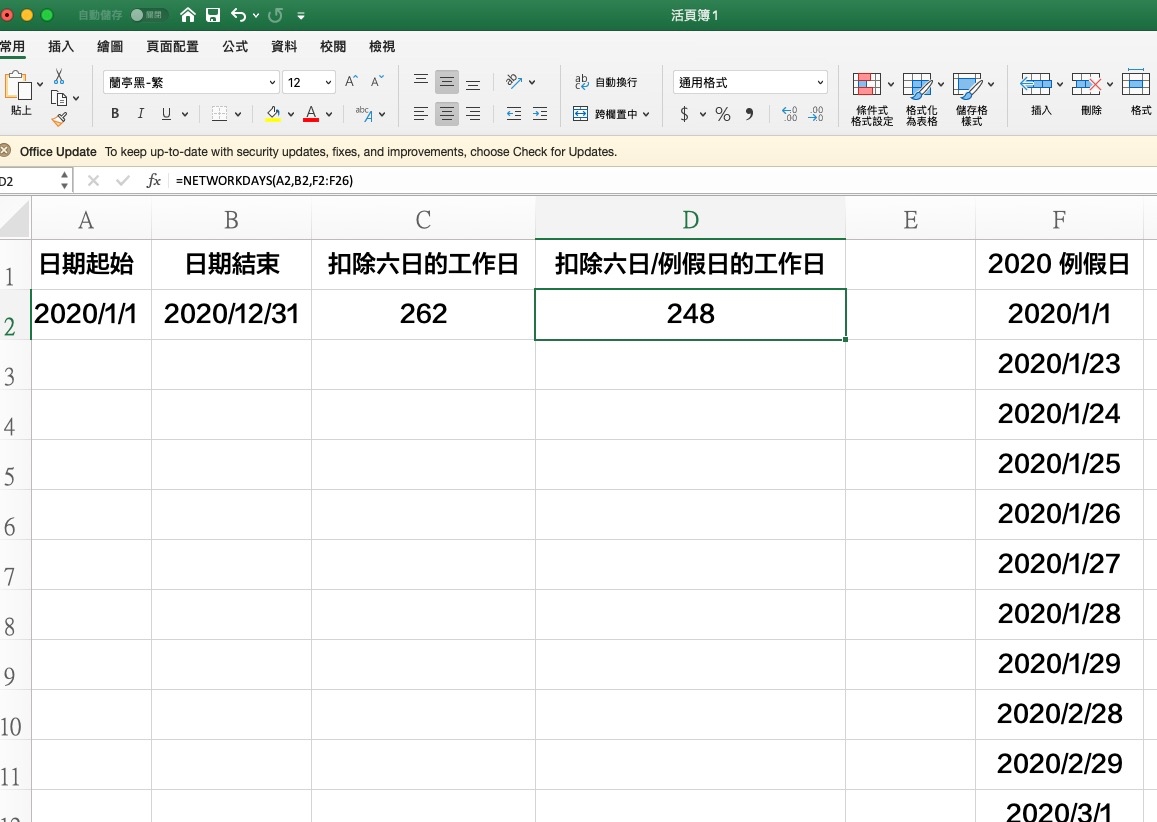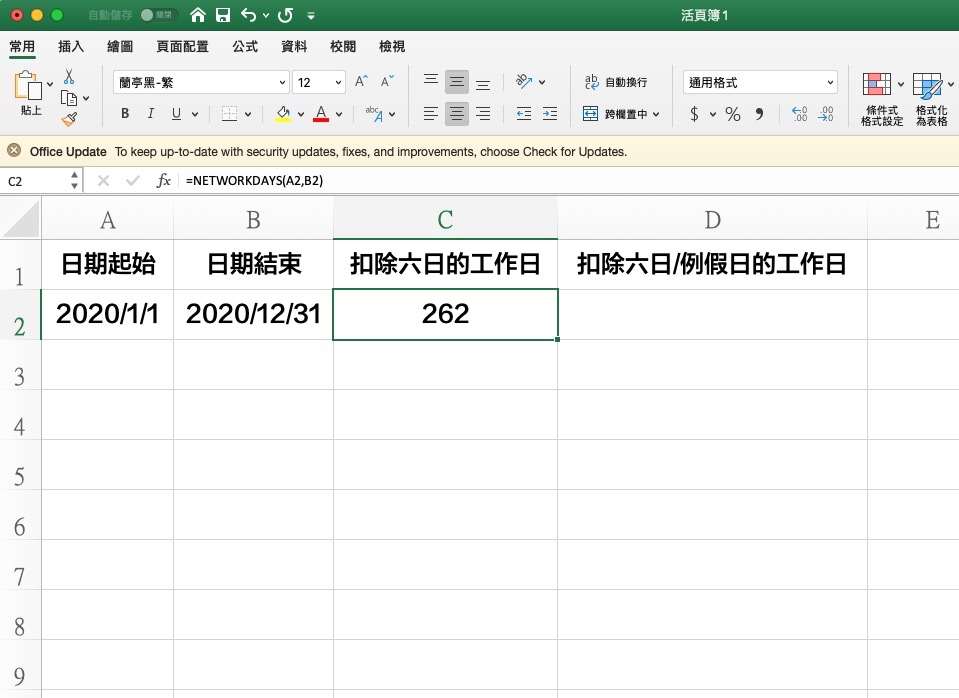 Excel 教學 - 如何計算某日期區間的工作日有幾天