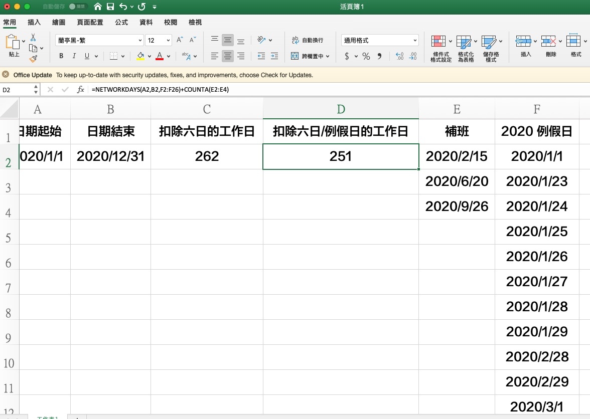 其實就是剛剛的公式後面再加上 COUNTA 這個函數,單純是計算補班的有幾格,這麼一來就得出最終結果,2020 年一共要上 251 天班,其實算下來一年有 1/3 都在休假啊....