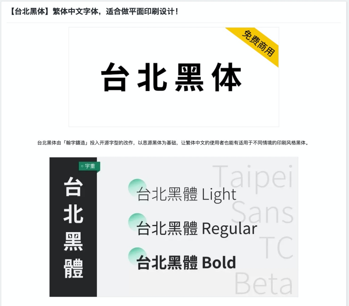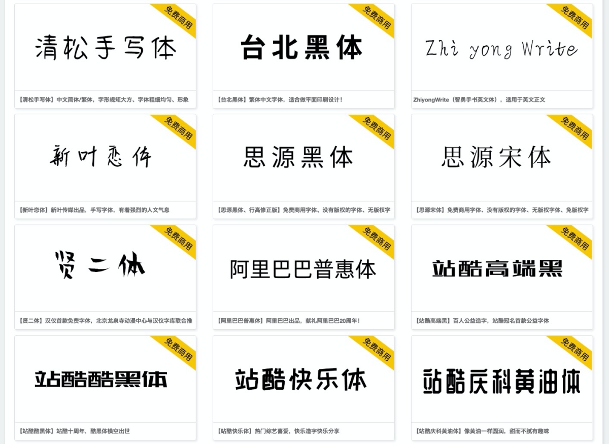 往下一看會發現很多我們曾經用過的,像是清松手寫體、台北黑體、思源黑體、普惠體等,站酷高端黑我倒是第一次注意到,原來是公益字體,很有海報風格說。