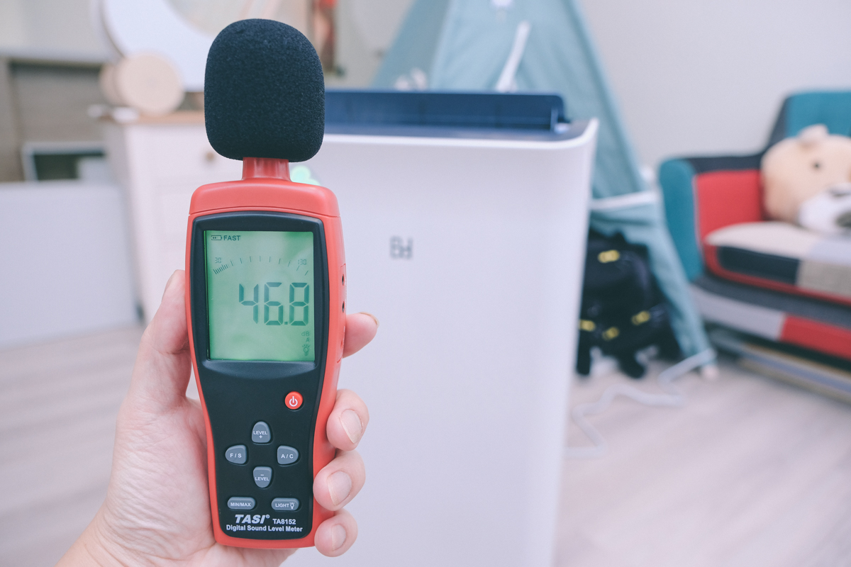 最後是最靜音的風速,測得 46.8dB,咦!?往回看一下我家只有開空淨機的狀態下是 44.7dB,所以在最靜音的風速下,幾乎是沒有為環境聲音增加太多感受,阿湯自己實際坐在一旁感受,確實只有一些運轉聲音。