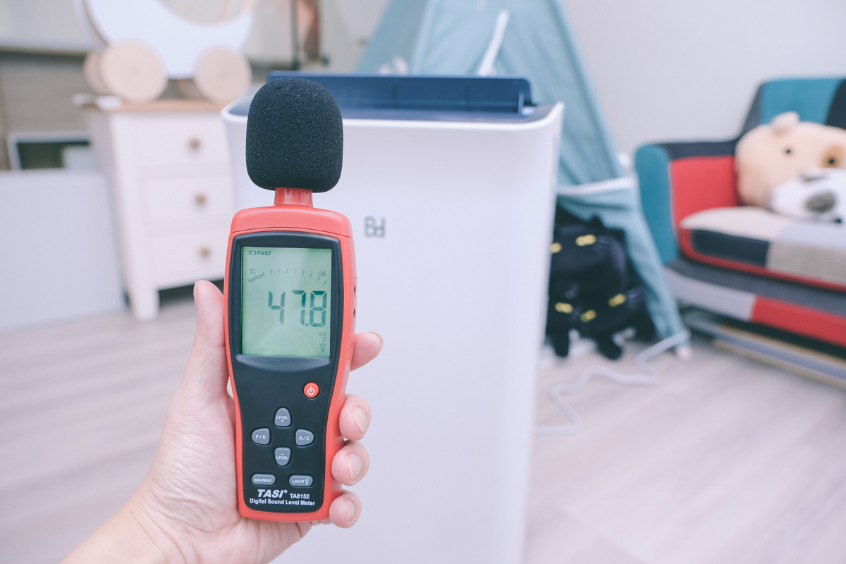 然後我在他壓縮機有運轉穩定時也測了一下(最靜音的風速下),僅多了 1dB,測得 47.8dB,這樣的音量即便是在睡覺時開啟也不會受影響,不過這還要看每個人對於聲音的敏感度,比如有些人只要有一點點壓縮機運轉聲就會被吵醒,但以阿湯自己來說,這樣的音量是沒有什麼差別的。
