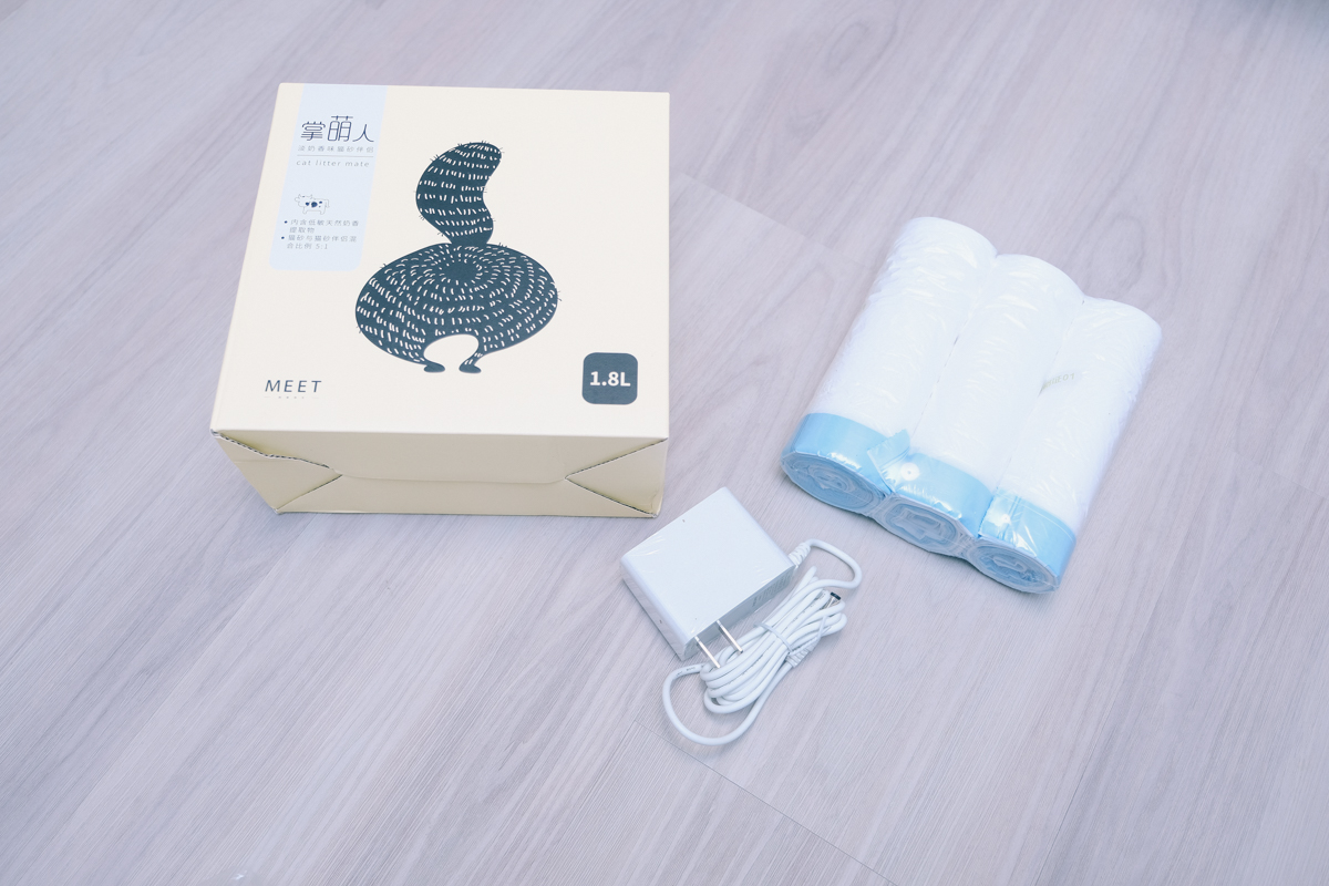 標配會送你一盒貓砂跟四組專用垃圾袋,還有電源,這個是國際通用電壓 100v-240v,所以不用擔心,台灣可以用。