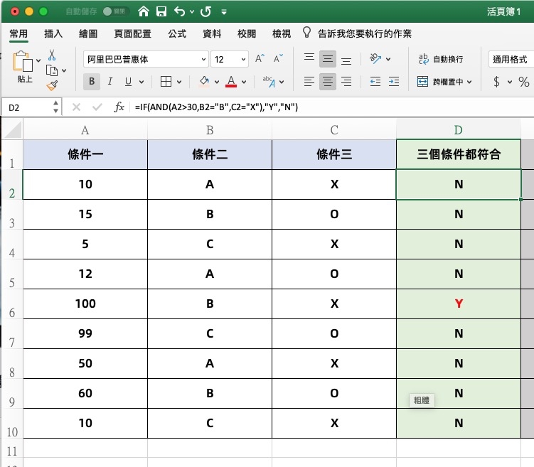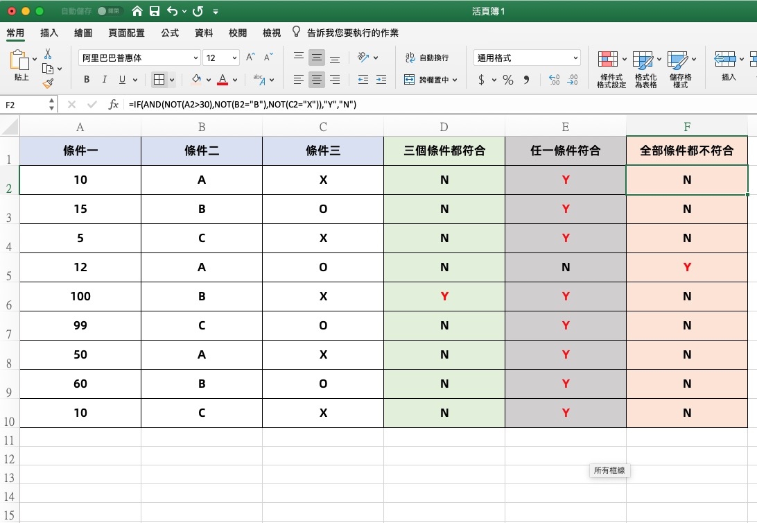 不過上述提到的 AND、OR、NOT 都是可以單獨使用的,所以不一定要搭配 IF,只是有搭配就可以指定結果 Y 要做什麼、N 的話又是做什麼。