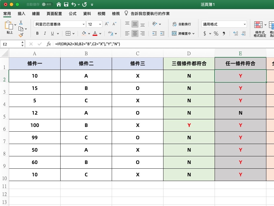 第二個:任一條件都符合,公式如下: