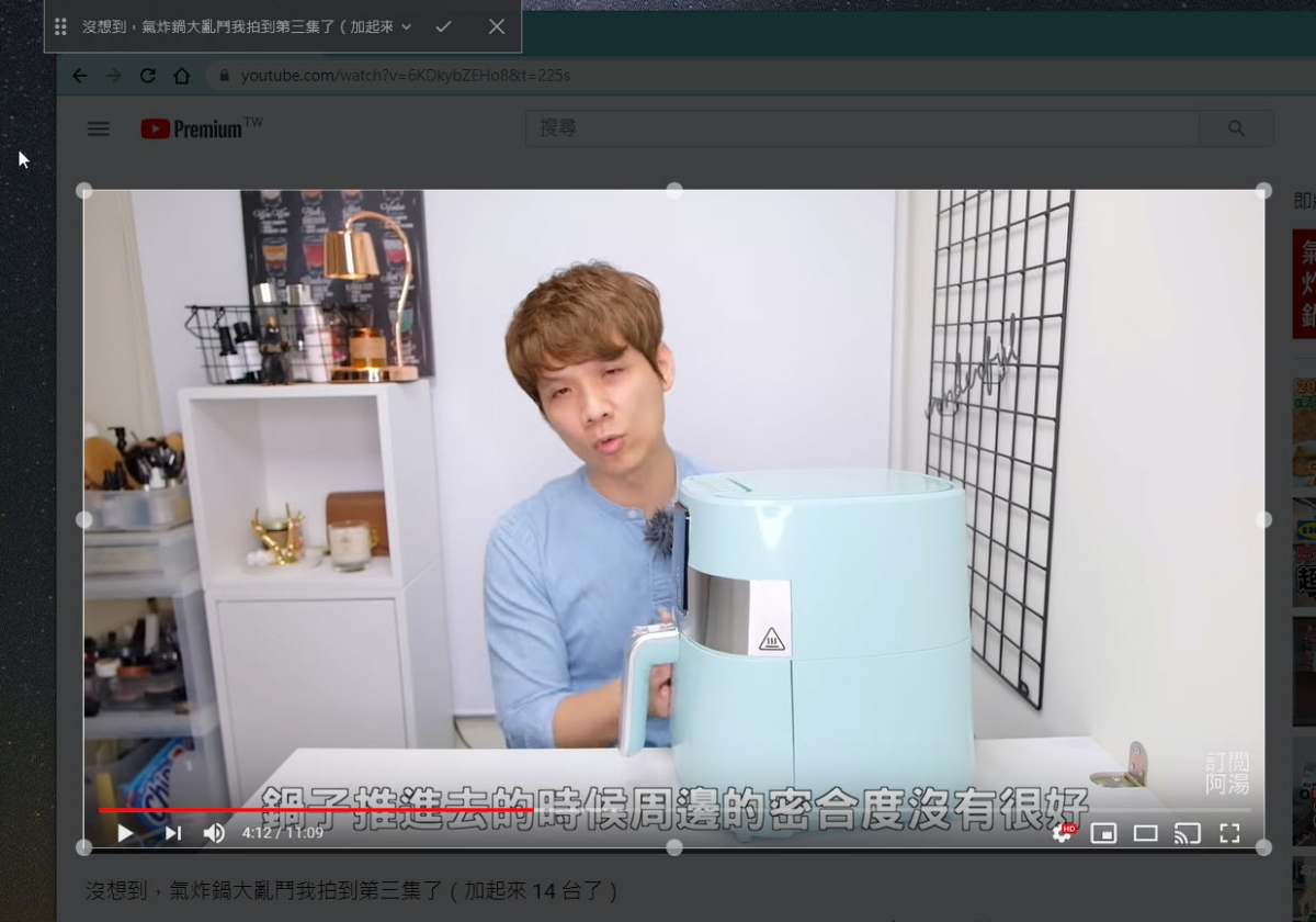 影片就會像這樣截取出來變成一個獨立小視窗,你可以移動到任何一角,這個獨立視窗會是自動在最上層,不會被其他頁面蓋掉。
