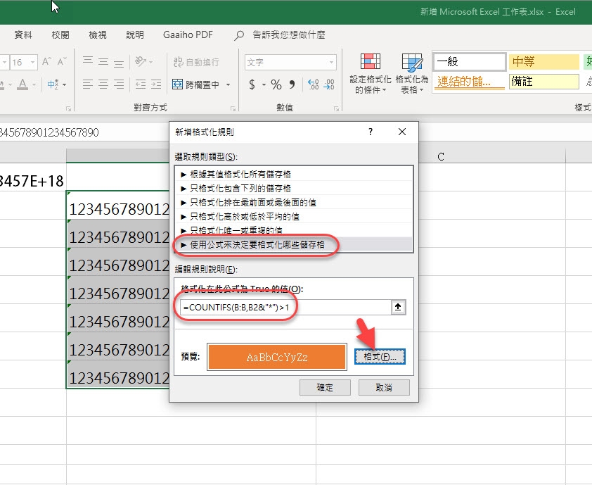 選擇「使用公式來決定要格式化哪些儲存格」,然後在公式欄裡輸入「=COUNTIFS(B:B,B2&"*")>1」,其中的 B:B 也可以改成要找出重複值的區間,比如 B2:B7,後面用 * 是來做為萬用字元使用。