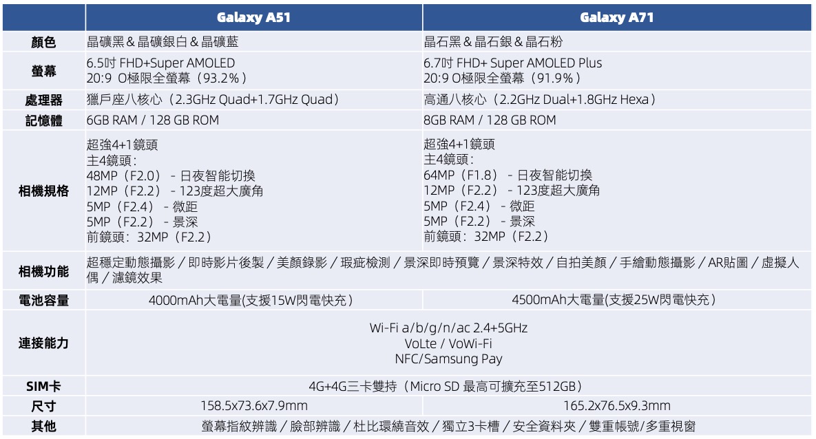 這邊提供大家 Samsung Galaxy A51 及 Galaxy A71 的比較表,給大家在購買時做個參考。
