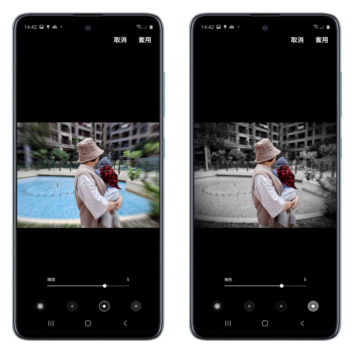 在 Galaxy A51 上的景深即時預覽模式下,在拍攝時只能選擇背景景深的等級,預設會是以柔焦的方式呈現,但其實我們拍攝完後,可以自行再選擇背景的景深模式,包括有柔焦、旋轉、縮放及抽色四種,透過不同的景深模式讓照片有著不同的呈現感受。