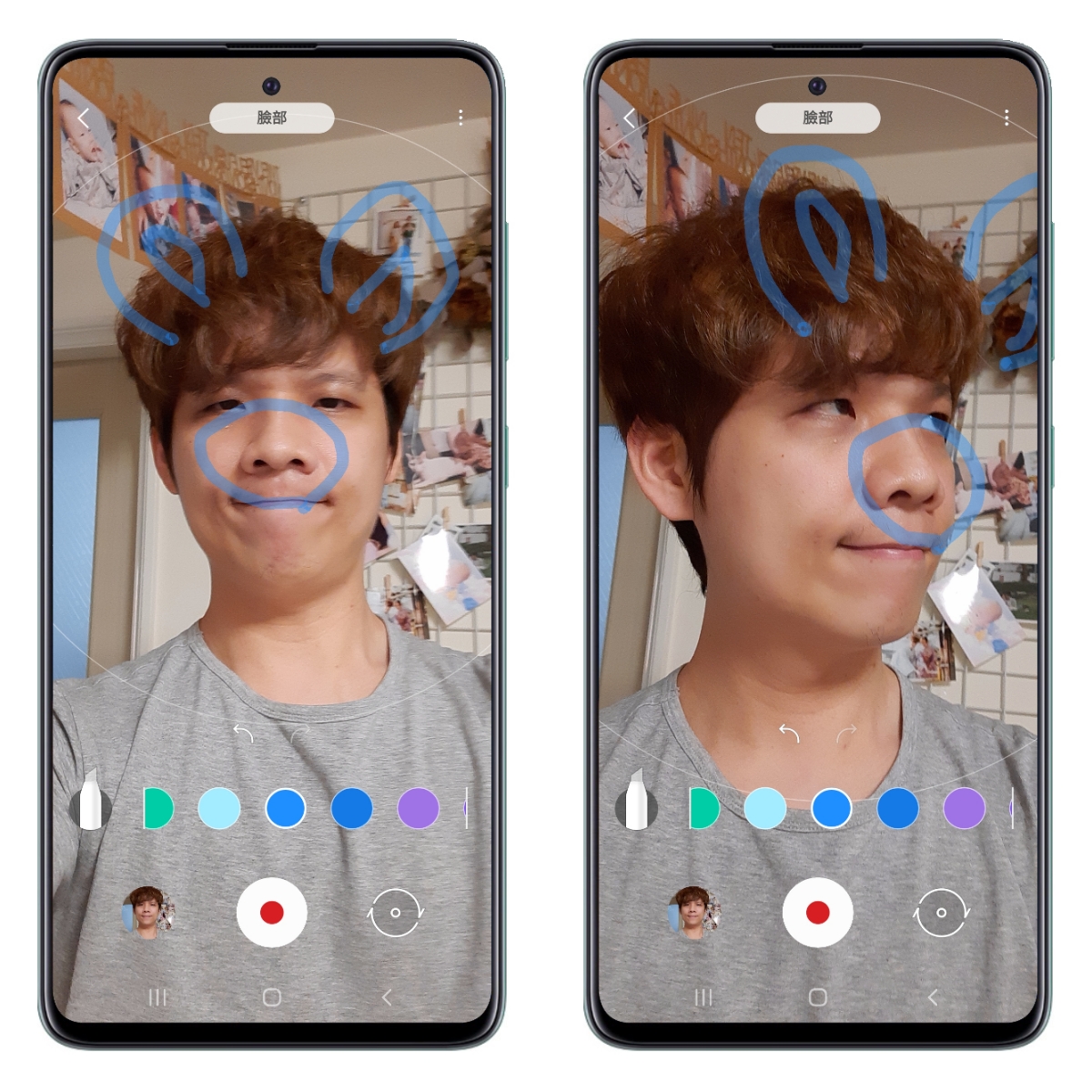 另外在前鏡頭的部份支援的模式也同樣一個不少,影片拍攝的部份不論前後鏡頭都有支援手繪動態攝影功能,這個在先前的 Galaxy Note10+ 功能中就有看過。