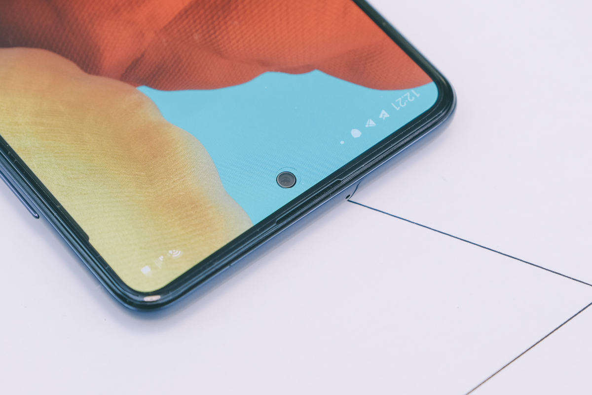 採用 6.5 吋 FHD + Super AMOLED、O 極限全螢幕設計,螢幕佔比高達 93.2%,標配出廠就已經貼好保護貼,且一樣附有淺灰色透明的保護殼,買回家拆開直接使用。