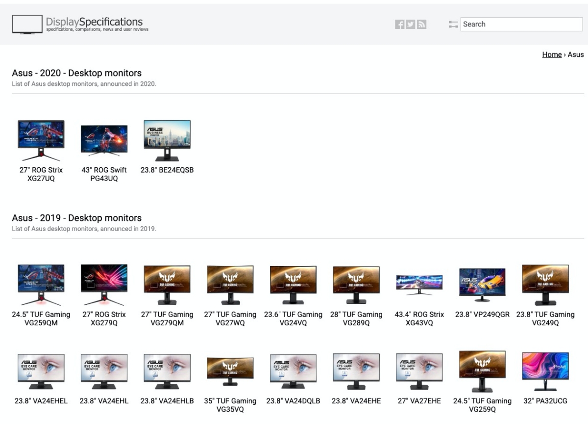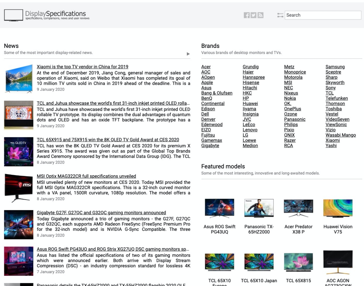 進入網站後,左邊主要是一些相關的新聞,右邊則是目前他們有收集的所有品牌列表,你可以透過品牌去找到你要查看的螢幕型號,或者直接右上角搜尋也是可以的,目前這個網站收集的資訊算是蠻完整的,我找了幾款螢幕去比對了一下,資訊基本上也都沒有錯誤,非常強大的螢幕規格網站。