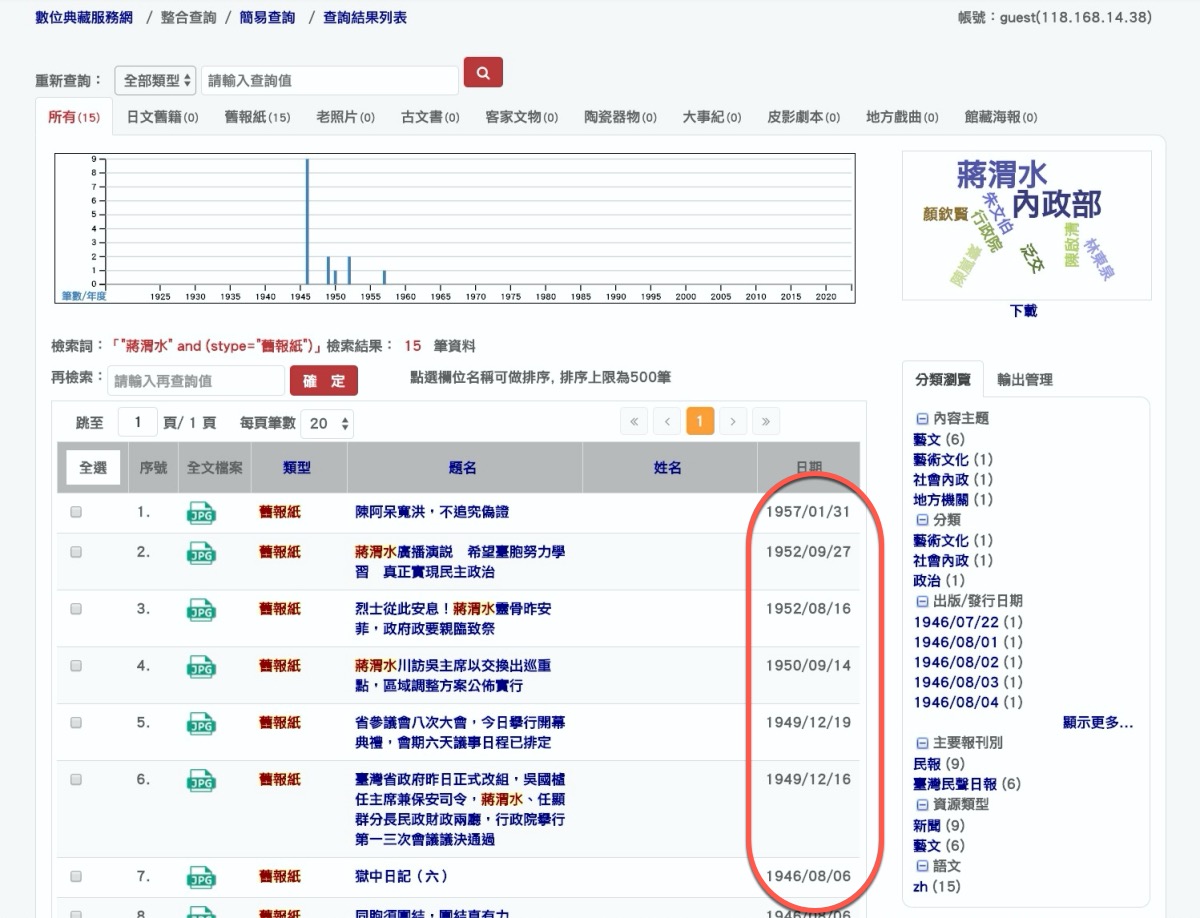 進入網站後,將「舊報紙」勾選起來,就可以搜尋關鍵字了,比如當時日據時代有很多事件跟人名都可以搜看看,我試了一下,搜尋年代也可以。
