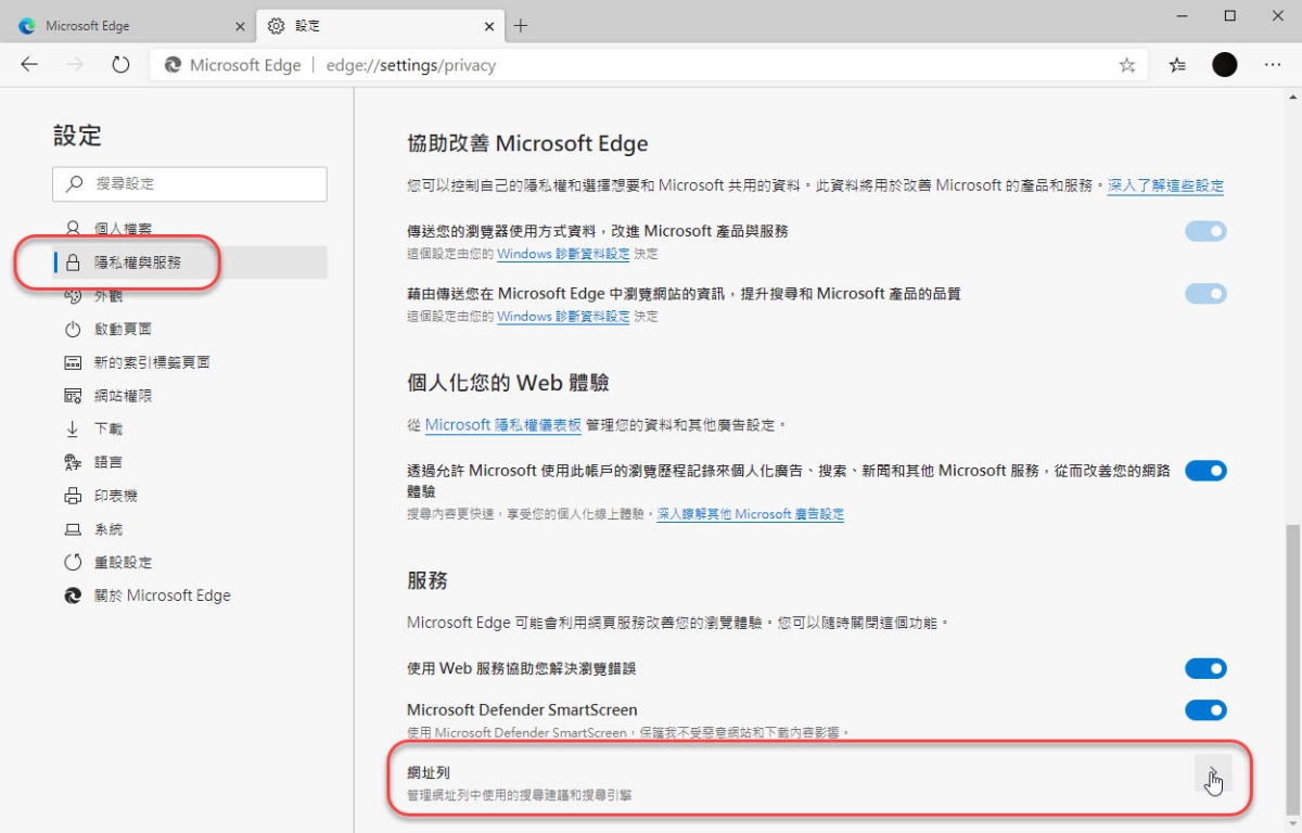 另一個在「隱私權與服務」裡面,找到最下方的「網址列」進入。