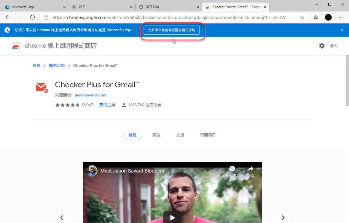 如果你想要安裝 Chrome Store 上的擴充功能,當你進入 Chrome Store 時,最上方會詢問你,只要「允許來自其他存放區的擴充功能」就可以安裝了。