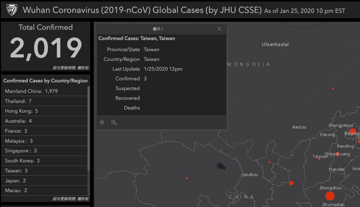 地圖上的紅點點點擊後可以查看該地區的各種人數狀況,以台灣來說,到 1/25 為止,一共有三個人確診,不過其實到 1/26 已經共四個人了,大家出門記得還是要戴一下口罩。