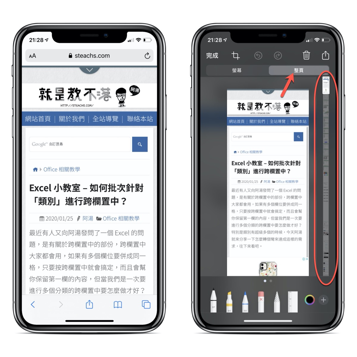 然後使用 Safari 去瀏覽想要截圖的網頁,以 iPhone 來說,截圖快捷鍵是「電源 + 音量上」,按了之後,在畫面左下角會跳出截圖的小圖示,點擊之後就會進入截圖的編輯畫面,這時你會看到上方會有「螢幕」跟「整頁」可以選擇,整頁的話就是一整個網頁的長截圖,在右邊可以拖曳預覽。