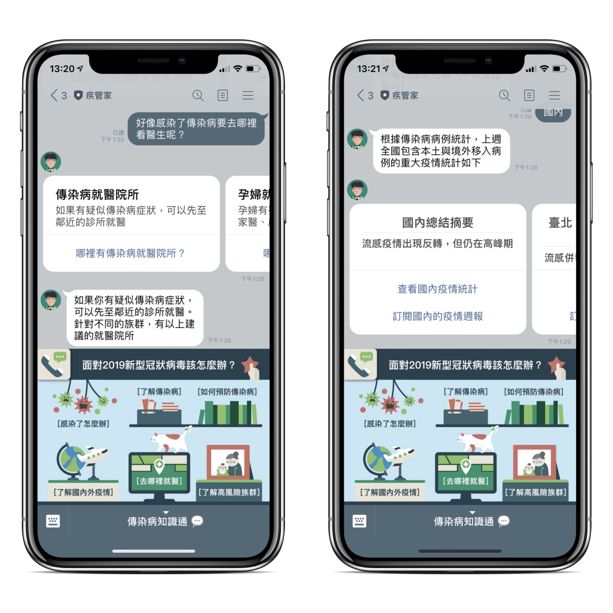 疾管家 LINE@:請點我(用手機開啟比較方便) 也可以在 LINE 搜尋官方帳號「疾管家」或「@taiwancdc」加入後就可以點擊各種資訊來查看,會是互動的方式來讓你獲得需要的資訊。