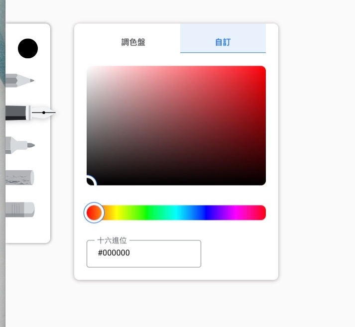 左邊就只有五種筆刷,看起來沒有其他功能,也沒有粗細可以選擇,單純就是筆刷跟顏色,除了預設調色盤之外,也能自訂顏色。