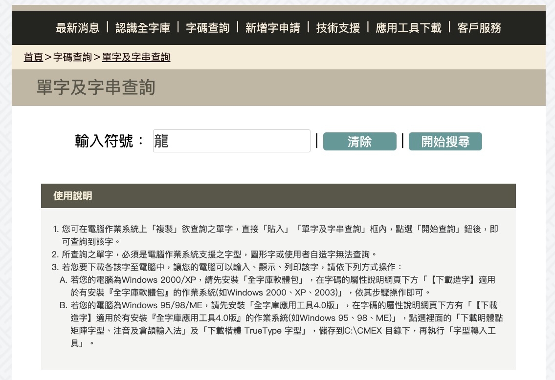 全字庫官方網站:https://www.cns11643.gov.tw/index.jsp進入全字庫官方網站後,可以在字碼查詢中,選擇「單字及字串查詢」。