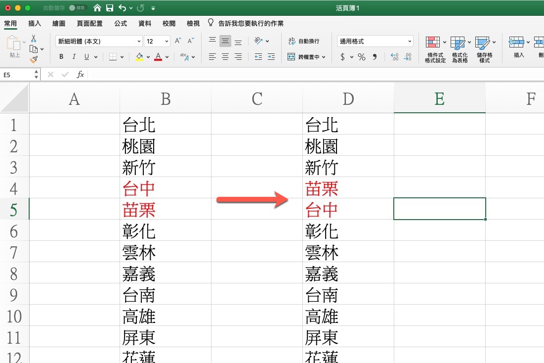 首先,需求大概是像這樣,原本在輸入資料你可能發現哪邊順序相反了,想要調整回來,比如以這範例來說,由北至南應該是先苗栗再台中,那麼我們要怎麼對調過來最快,往下來看。