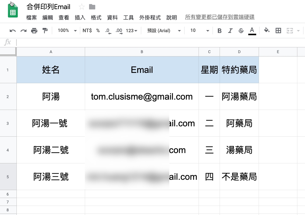 接下來請去開啟 Google 試算表,然後先編列好要寄件的一些統一資料,比如信件會需要用到的姓名、Email、批次資料等,阿湯這只是編一個範例,等等往下看就知道是怎麼使用。