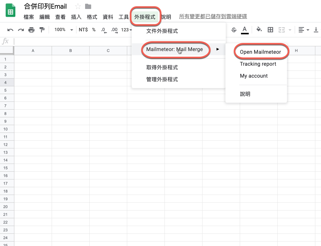 編輯好內容後,點擊上方的外掛程式 > Mailmeteor > Open Mailmeteor。