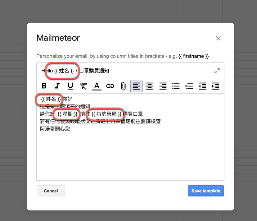 範本就像這樣,不論是 Email 標題或內容,你都可以用批次資料來取代,就是我們剛剛事先在試算表中已經編輯的內容 ,其中包括姓名、星期跟特約藥局,這些文字你只需要用 {{ 內容 }} 來取代,裡面填寫的文字要和你試算表第一排的標題一樣,那麼每一封郵件就會按照你的資料幫你自動填入,這就是合併列印的功能,編輯完後點擊 Save template 儲存。