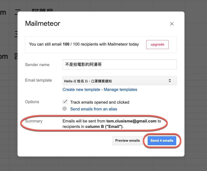 回到這個畫面時,就可以看到 Email Template 已經選了好你剛剛編輯的範本,Summary 的部份可以注意一下他抓取要寄送的 Email 欄位是否是你填寫的那一欄,像阿湯是打在 B 欄,就有顯示 column B,確定無誤後就可以按下 send emails 寄出。