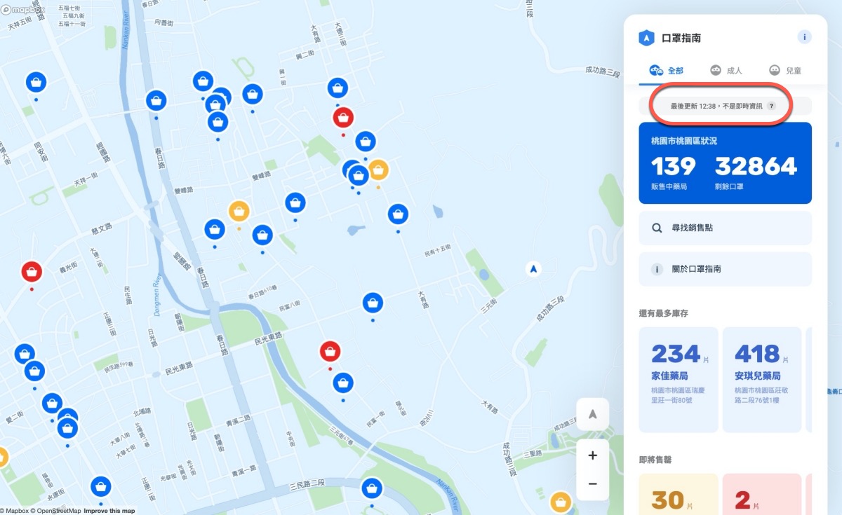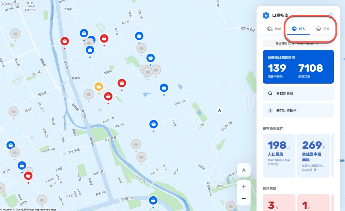 然後右上角可以切換要篩選的口罩類型,主要就分成人跟兒童,接下來就只要看地圖上的標示顏色,基本上灰色就是賣完了,藍紅黃都可以點進去看一下。