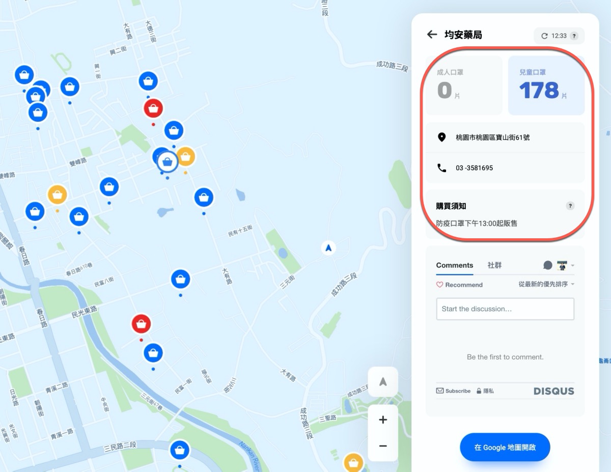點擊後也會有每間藥局的詳細資訊,部份還有標示購買須知,就是幾點才開始販售,算是相當不錯,因為目前每間藥局開賣時間不等於營業時間,所以前往時也最好先打電話問一下。