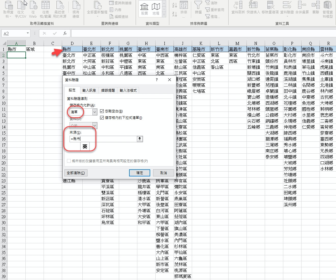 在第一個儲存格內允許選擇「清單」,第二個來源輸入剛剛建立的名稱「=縣市」,這裡就是看你標頭是打什麼就是什麼。