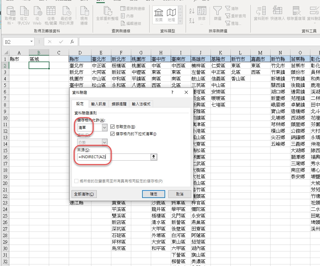 儲存格內允許一樣選擇「清單」,來源的部份請輸入「=INDIRECT(A2)」,INDIRECT 這個就是指引函式,還不知道用途可以去查一下,這個我們用 A2 來對應的意思就是,當我們在 A2 選擇某個縣市,就會依照定義的名稱去對應清單,所以在這裡只要用這個函數就搞定。