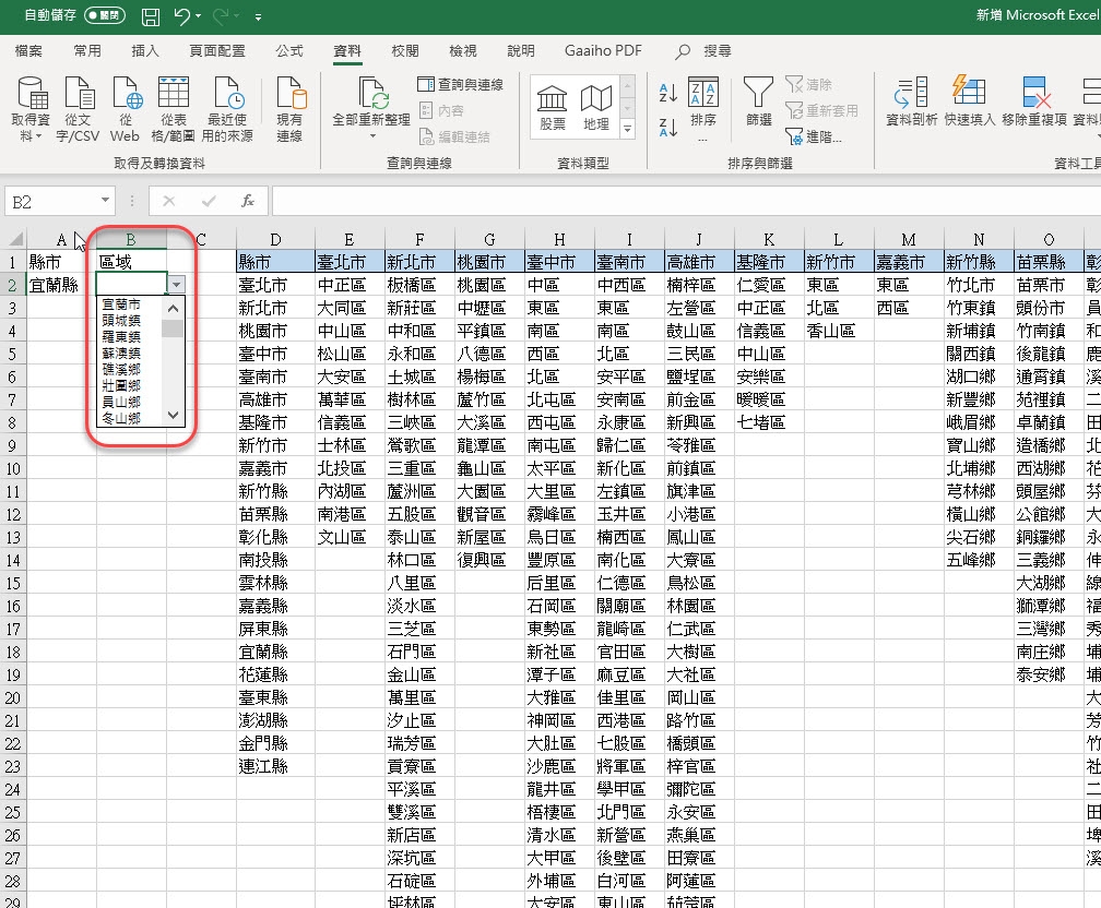這樣當我們第一層假設選擇宜蘭縣時,再去選第二層就只會出現宜蘭的鄉鎮區市可以選擇,就這麼簡單完成了多層級選單,如果你還想要做第到第三層,就是資料做好後,第三層的公式就會是變成 INDIRECT(B2),以此類推,大家快去試看看吧。