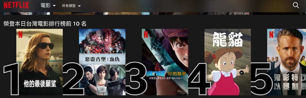 現在開始用戶除了可以在首頁上看到右上角有著「TOP 10」 圖標的排行榜片單,點選「節目」或是「電影」的時候,也能看到個別的 10 大熱門作品分類。例如今天 Netflix 的「台灣電影排行榜前 10 名」 就分別是「他的最後願望」、「惡靈古堡:血仇」、「勇者鬥惡龍 你的故事」、「龍貓」、「鬼影特攻 以暴制暴」、「愛的過去進行式 P.S. 我仍愛你」、「原鑽」、「陽光普照」、「黑豹」、「死侍」等 10 部。