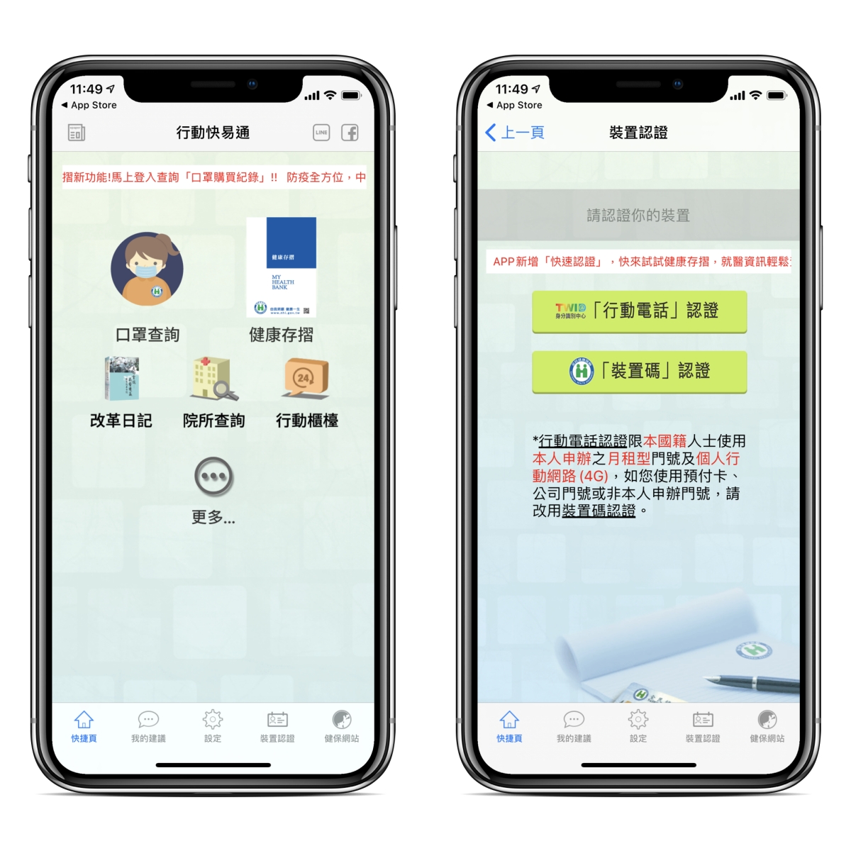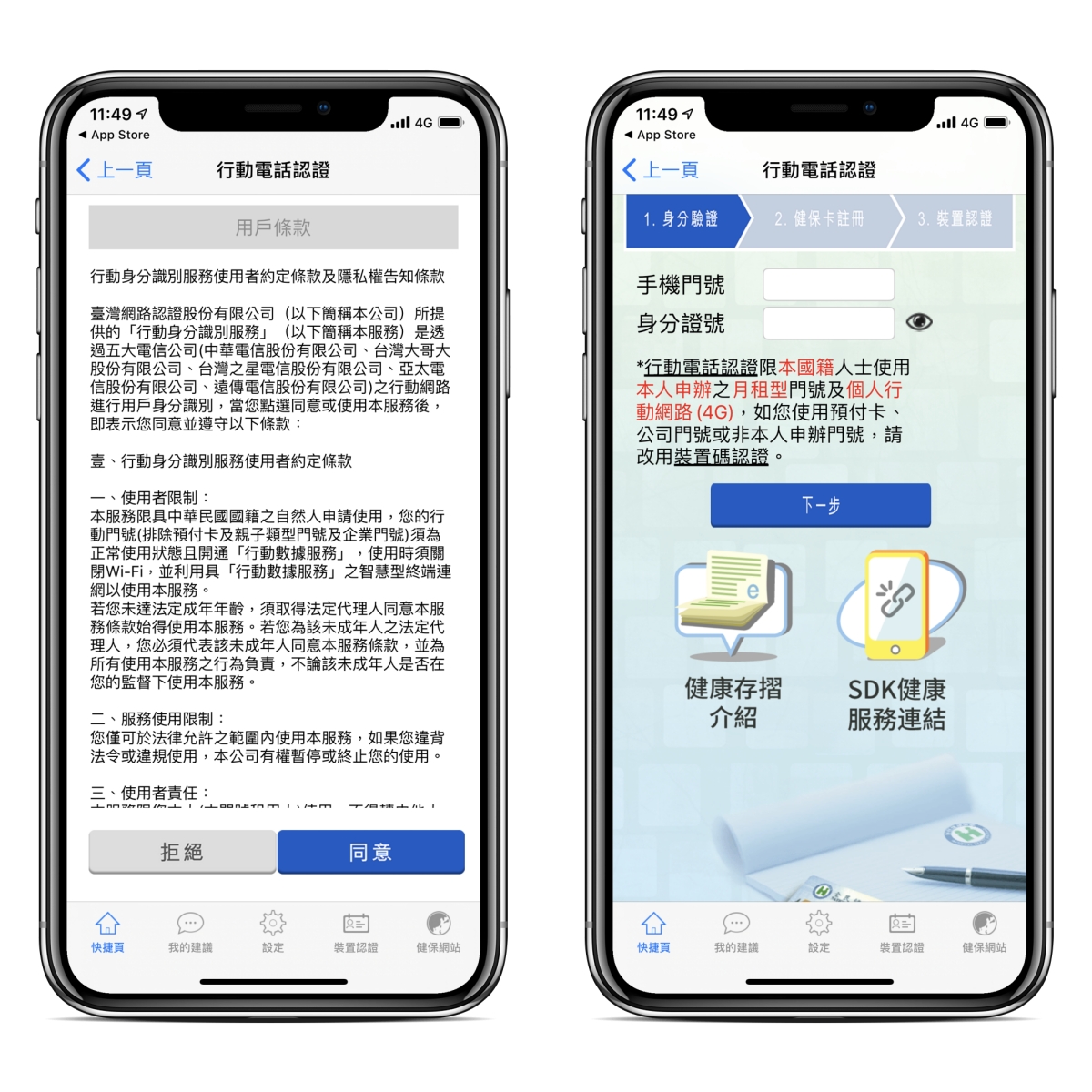 在 APP 首頁就有一個「健康存摺」,進入後會有二種認證方式使用,我自己覺得行動電話比較方便,大家可以自己選。