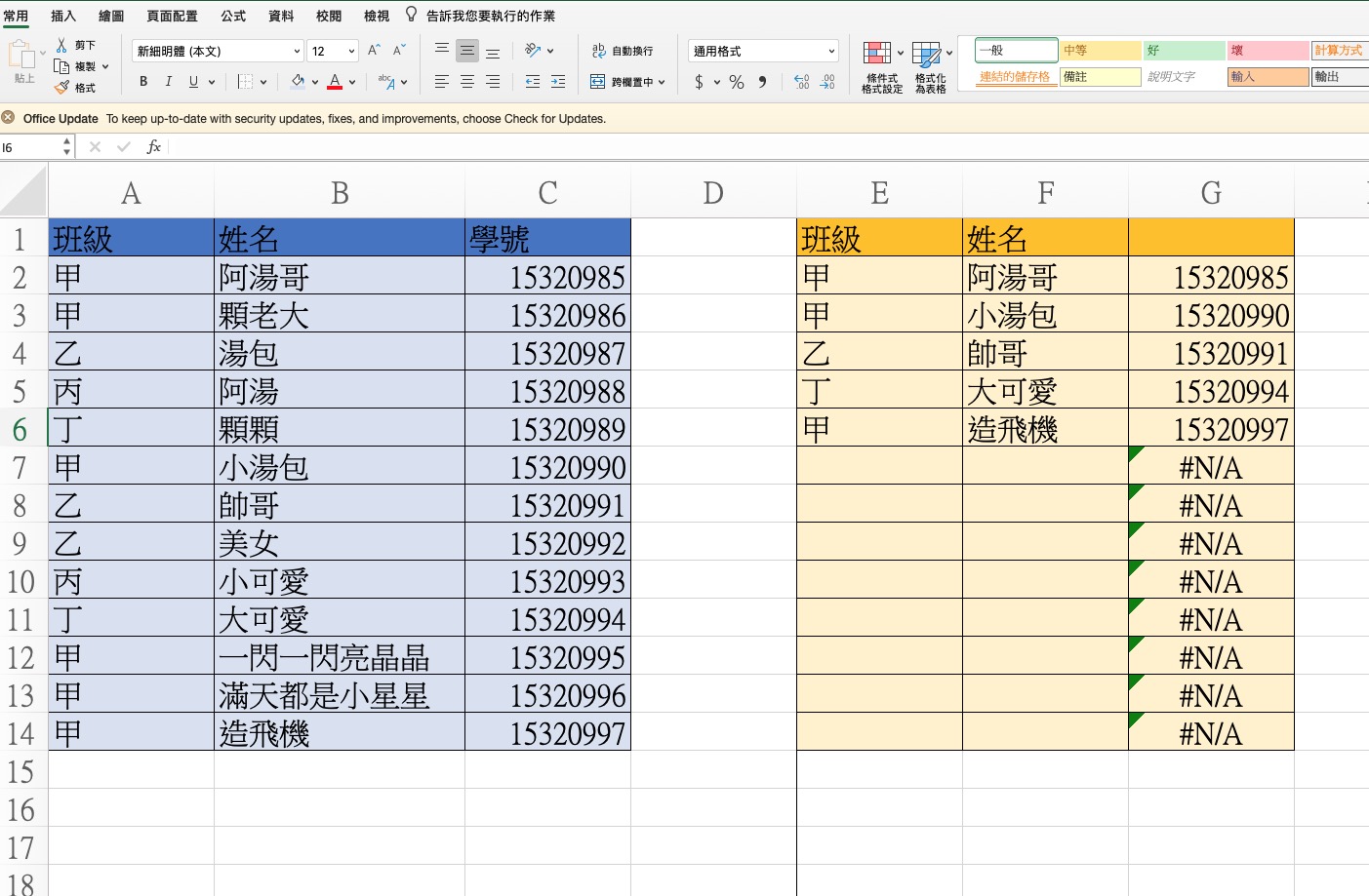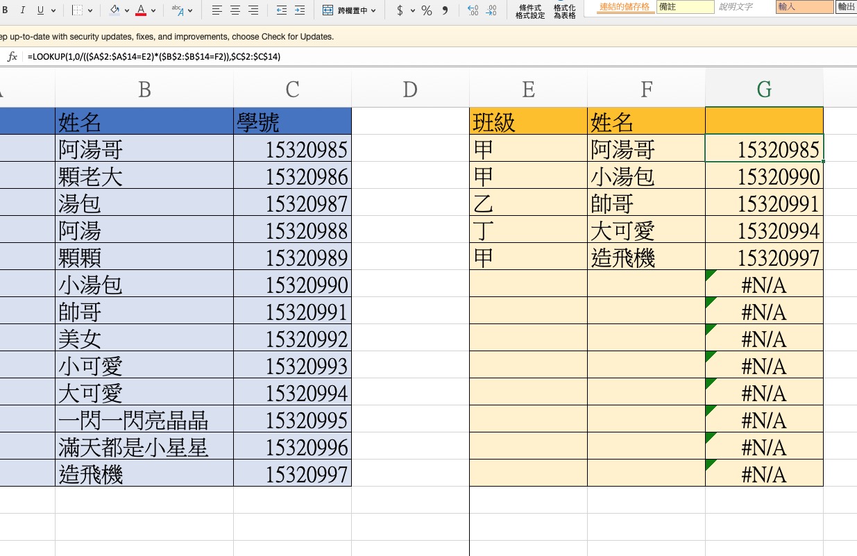 LOOKUP 就如同他的英文翻譯一樣,查閱,也就是查找資料,下面就用 LOOK UP 的基本用法來達成以下需求,比如左側為資料內容,右側是用來查找資料用的,大概說明一下,E 跟 F 欄位是用來填入搜尋條件,當符合二者條件時,會在 G 欄顯示需要的結果,以這範例來說,就是輸入班級跟姓名,就會在 G 欄顯示學號,往下來看怎麼做。