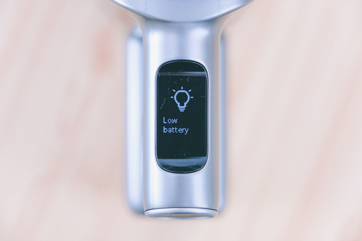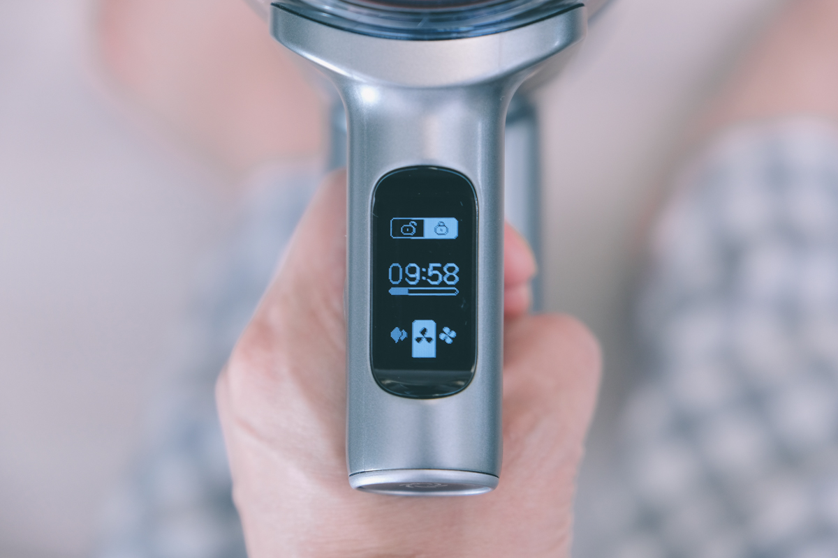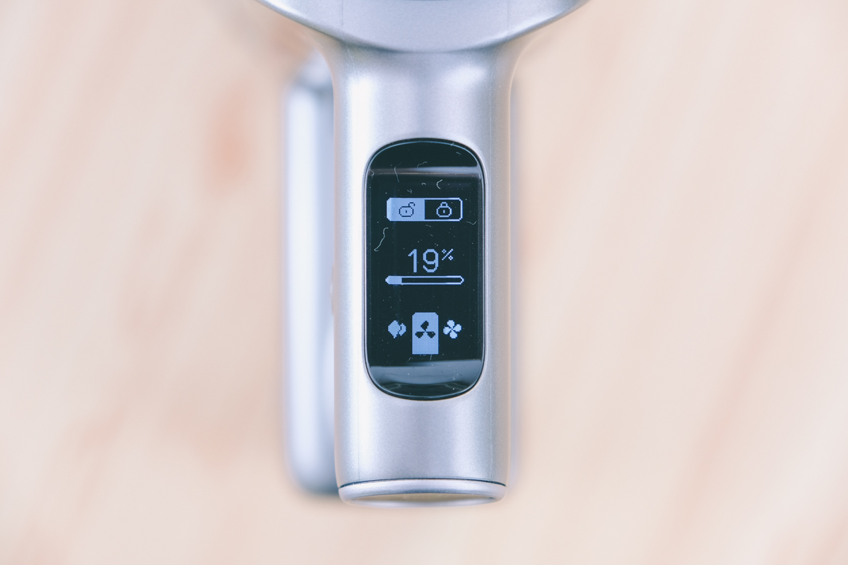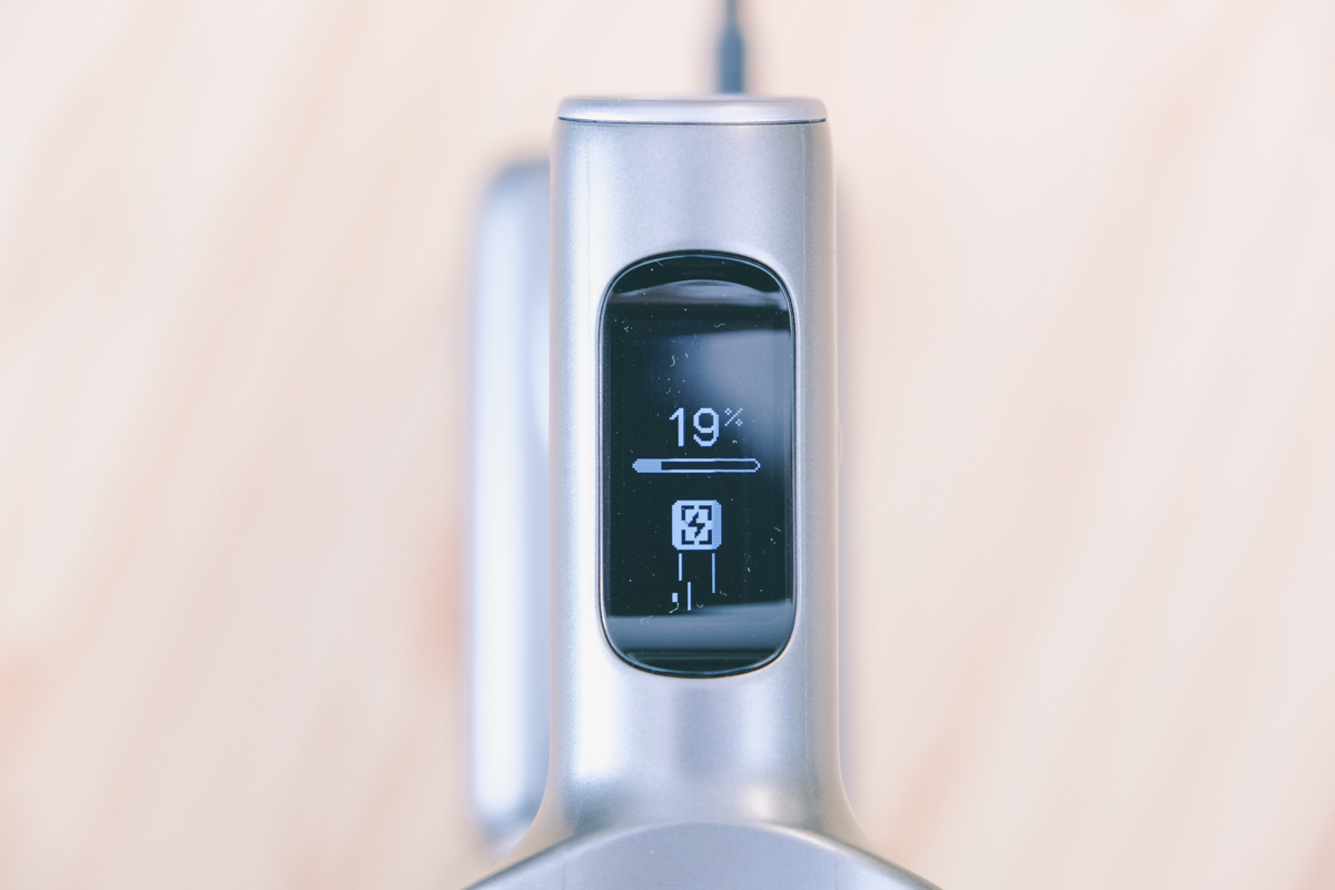 首先,H6 的手握處上方搭配了一個 OLED 螢幕,當你按下任一個操作鍵就會顯示畫面,不使用時會全暗待機,一般我們在使用吸塵器時只能看電力燈號剩幾格來判斷電量,或者