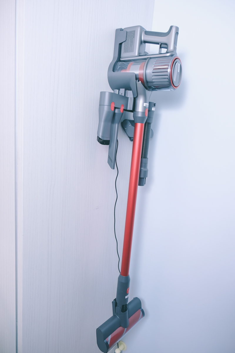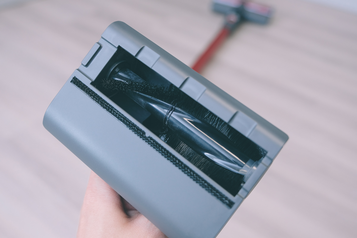 最後,充電壁掛架的設計也相當的不錯,標配的多種配件通通都能掛上去,不用再分地方收納, 一般吸塵器的收納架都只設計給「常用配件」的收納,多出來的只能額外再找地方收納。