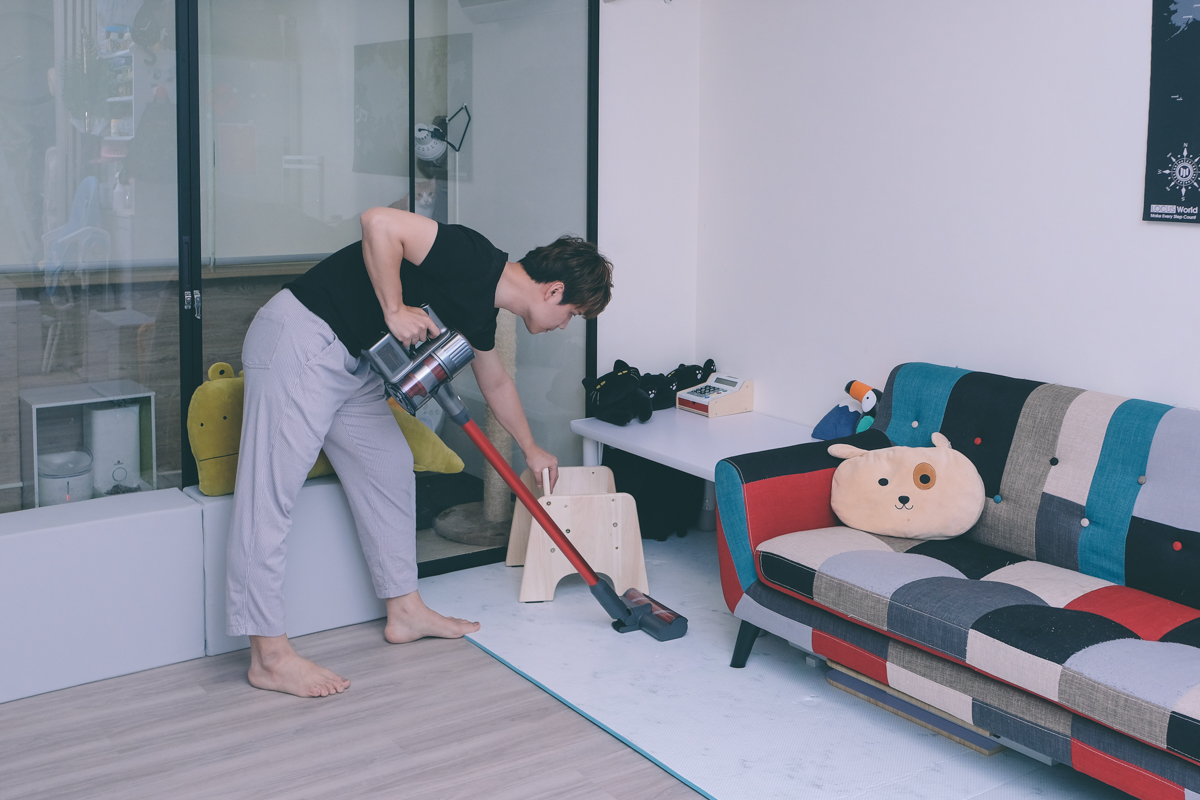 接下就是由阿湯這個萬年長工來為大家示範一下我們家的清潔,首先最基本款,就是接上軟絨滾筒刷把地板大範圍的全部吸過一次,不放過所有的角落。