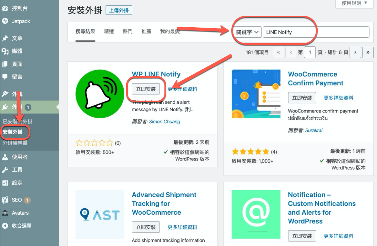 進入你的 WordPress 後台,在外掛 > 安裝外掛,輸入關鍵字 WP LINE Notify 搜尋,就會找到,直接安裝吧。