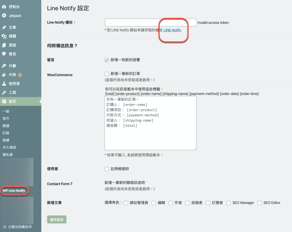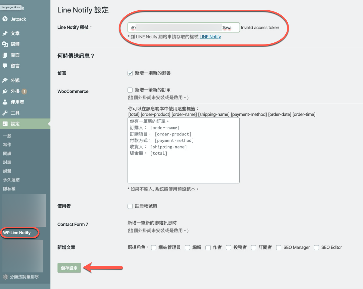 貼上後按儲存就可以了,這樣只要有新的留言就會即時透過 LINE 通知你,如果你是想要通知 WooCommerce 的新訂單,下方勾選後再設定範本即可。