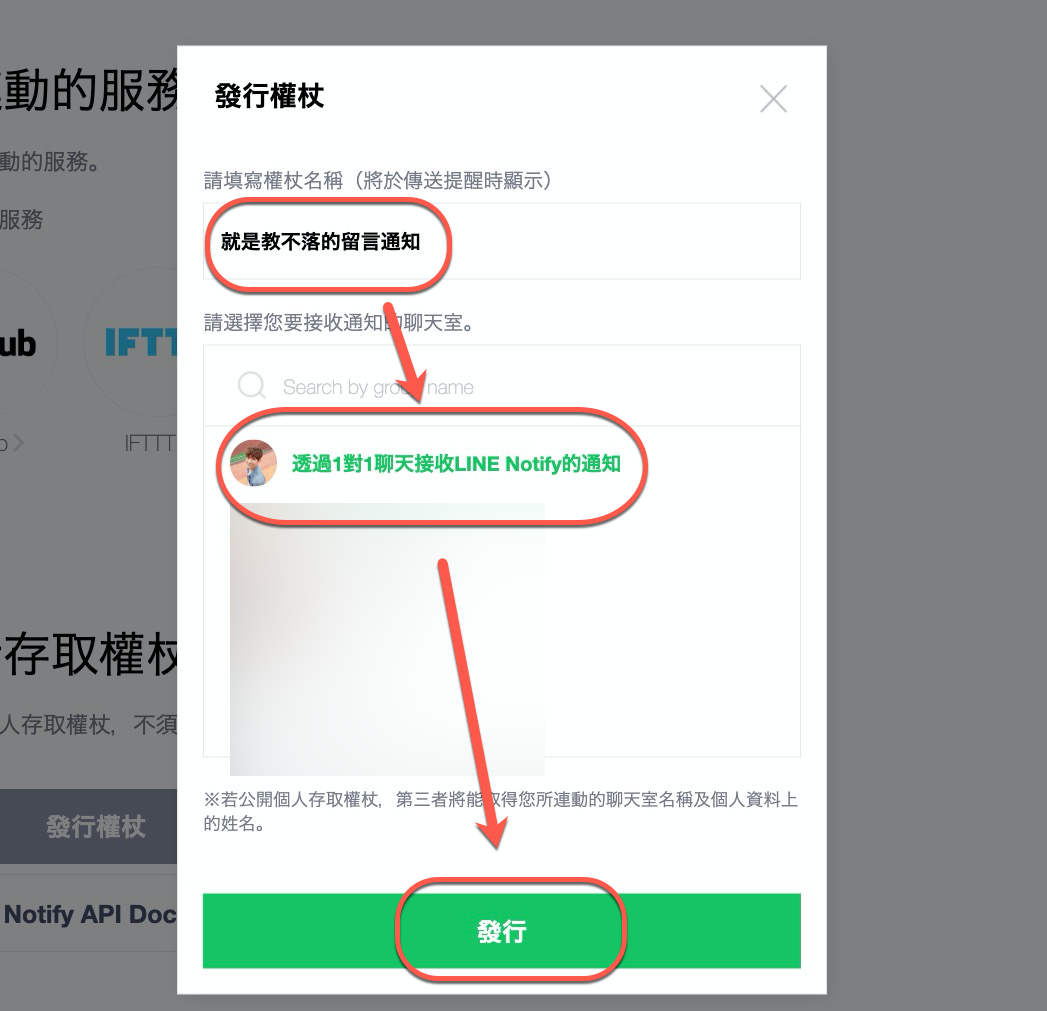 然後輸入一個你自己看的懂的名稱,然後選擇下方你自己的 LINE 頭像,透過一對一聊天接收 LINE Notify 的通知,按下發行。