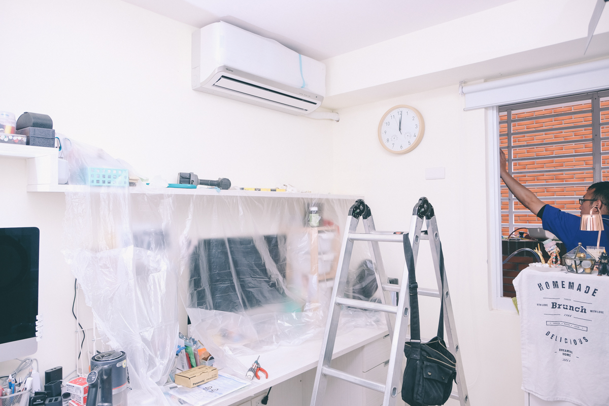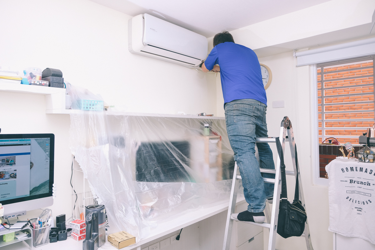 在安裝的一開始,我就必須讚賞一下他們的施工 SOP,為了不讓安裝時造成的灰塵弄滿書桌,所以有先貼上一層防塵的塑膠套,老實說,安裝冷氣第三次了,這是第一次有工班上一層防塵的塑膠套,我家剛裝潢時,那爛工班不僅沒弄防塵的,還亂丟舊冷氣的零件,把剛刷完油漆的牆面全弄髒了,這服務跟細節真的是立見高下。