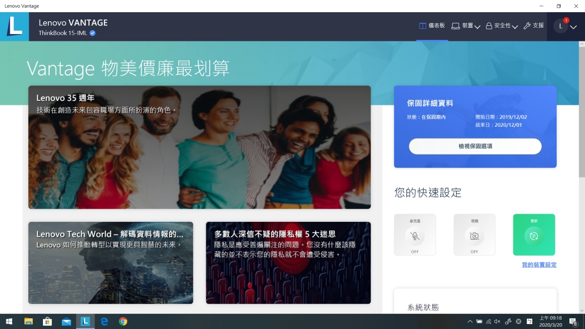 另外筆電預載有 Lenovo 自家的軟體「VANTAGE」,可以在這裡面查看你的筆電各種狀態,包括像是保固的詳細資料,或是各種設定的快捷按鍵。