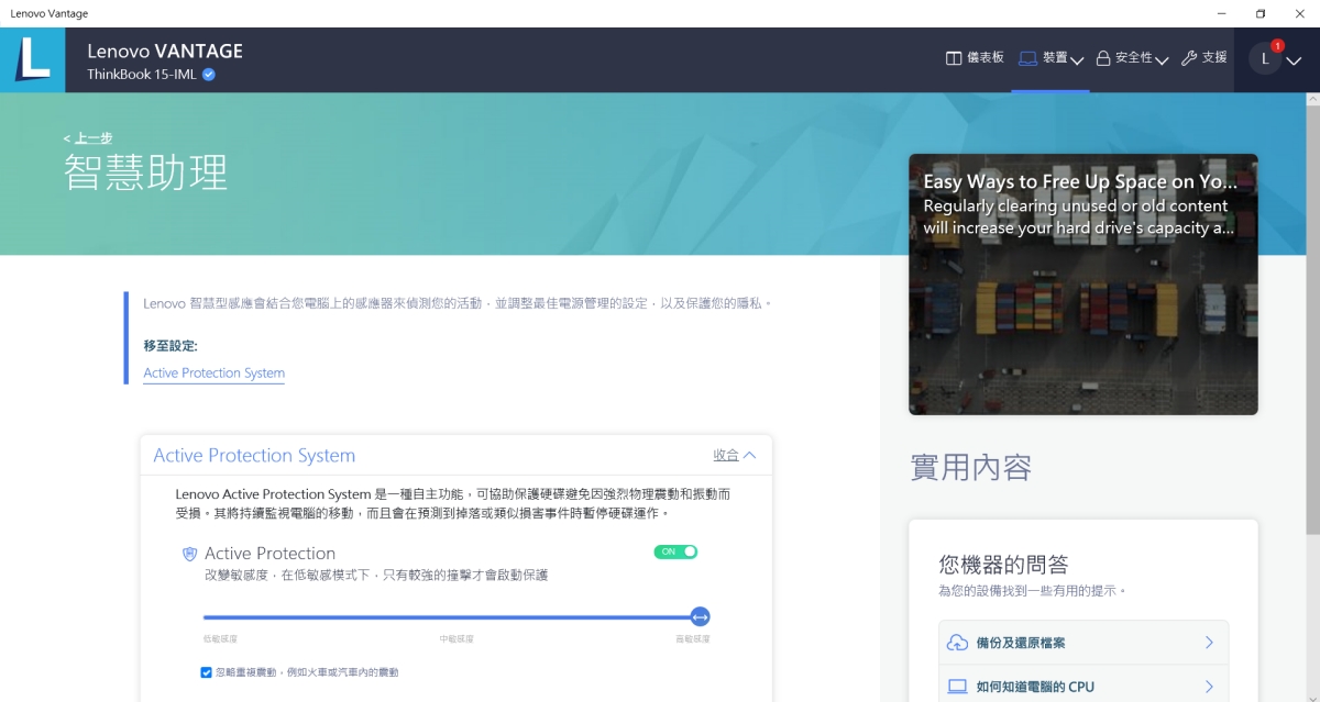 VANTAGE 裡還有一個非常實的功能叫做智慧助理,其中有一項功能叫做「Active Protection System」,主要是會偵測你的筆電是否受到撞擊或強烈的物理震動,透過這個系統會持續性的監視電腦的移動,當偵測到掉落時會立即暫停硬碟運作,來避免硬碟受到損傷,讓你的資料更加的安全。