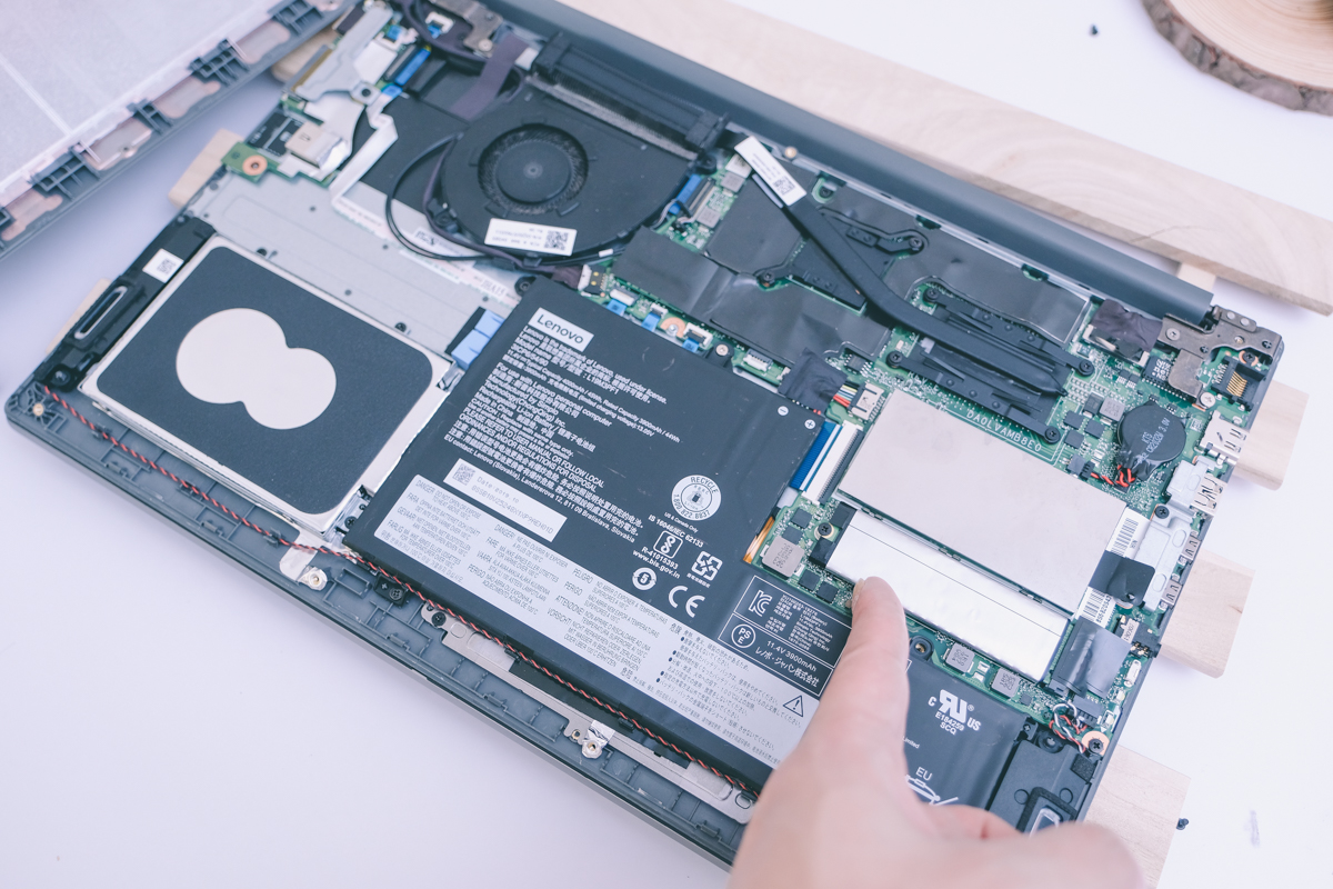 基於好奇心發作,也打開了 ThinkBook 15 底部來看了一下,拆卸不難,一眼看過去的話,未來如果需要升級或更換 SSD 及硬碟完全沒有難度,記憶體的部份我一眼這樣看過去,SSD(我手指指的地方)跟左邊的 HD 都很容易可以自行更換或升級,記憶體的部份有提供一個插槽可以自行升級,主機板上則會有預載 4GB 或 8GB 已經焊接上去的,所以記憶體我個人是建議一開始就可以攻頂。
