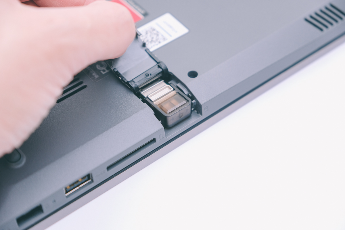 這個隱藏式的 USB 槽只要推一下就可以打開,是個很貼心的設計,比如可以將常用的 USB(迷你型的)插入後關起來,就不會凸一個在筆電外緣,工作到一半要放進包包也不用先拔隨身碟,不用擔心會去勾到包包的問題,或是像使用 2.4GHz 連線的滑鼠接收器,通常也是很小一個,就可以直接插到這個隱藏 USB 槽裡,讓你的筆電側邊更美觀,也很便利。
