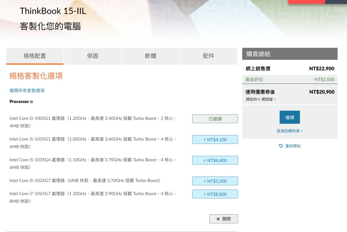 ThinkBook 15 預設主要有三種規格,最低從 NTD 20,900 元起到 NTD 30,900,後面二個主要差在處理器,不過只差 3 千塊真的蠻可以考慮直上 i7 的版本,不過不論哪一款都是採用第十代 Intel 處理器,效能都是有相當基本的水平。