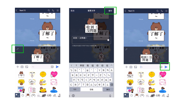 如果想要更改文字的話,直接在聊天視窗內選擇想傳送的特定一張貼圖,再按左邊的鉛筆 icon 直接編輯貼圖上的文字,改好後按下右上角的儲存鍵,直接送出完成!