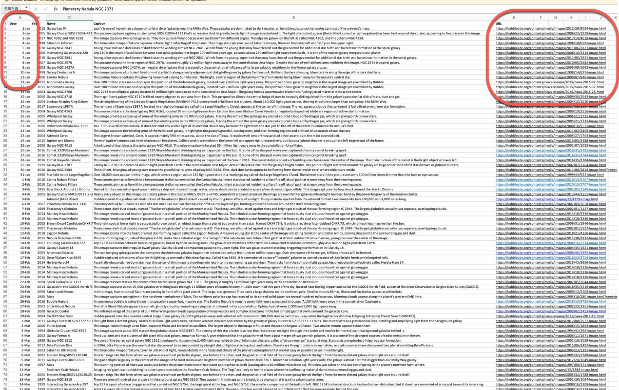 另外如果你想更快的查詢的話,也可以在第一個畫面那,下方有個 Text Version,點擊後可以下載到一份 Excel 檔案,裡面就列好了 366 張照片的日期跟相關資訊,最左邊是日期,是照排的,最右邊是照片的網址,從這裡查找也是可以的。